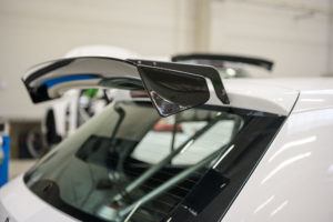 Najnowsza ewolucja otrzymała też kilka elementów wykonanych z włókna węglowego. Jego charakterystyczną teksturę zauważycie chociażby na tylnym spojlerze. Z karbonu wykonano też lusterka i wlot powietrza na dachu. W poprzedniej wersji te podzespoły miały połyskujący czarny lakier.