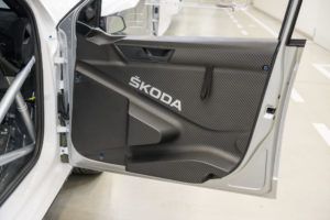 Fabię R5 Evo można także rozpoznać, gdy kierowca lub pilot uchylą swoje drzwi. Wewnętrzne boczki nie mają już karbonowej powierzchni. Są całkowicie czarne. Dodatkowo, w drzwiach pilota przy krawędzi słupka można dostrzec szary element w kształcie litery L. To dodatkowa pianka absorbująca energię bocznego uderzenia.