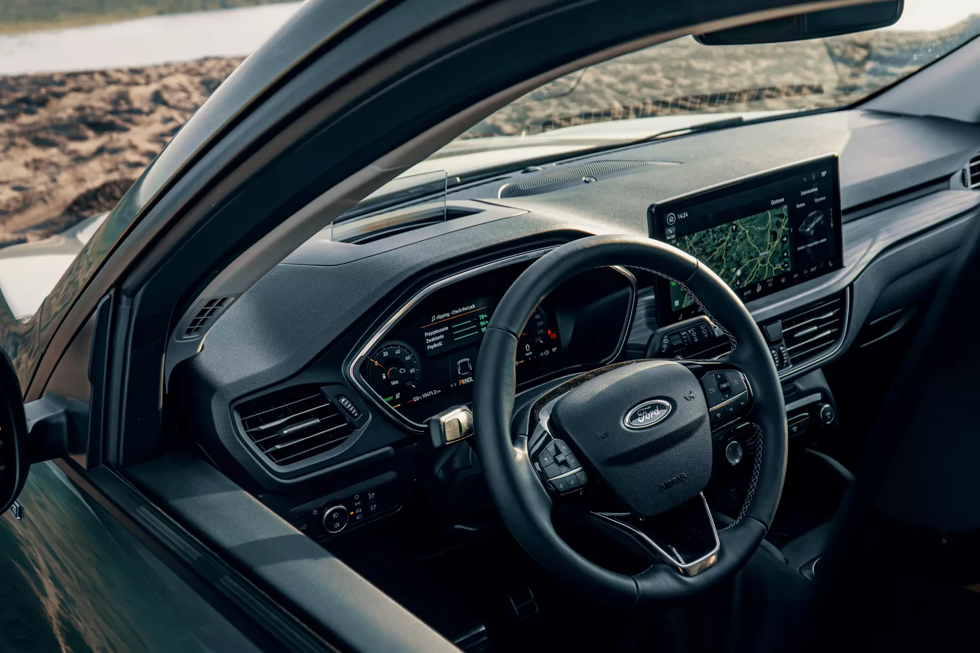 Snując się spokojnie po ulicach miasta docenić można wygodne wnętrze Forda, mięsiste fotele, nowoczesne multimedia i bardzo przyjemny zestaw audio. Niezawiedzeni będą też pasażerowie drugiego rzędu siedzeń. Miejsca jak i wyjść USB tam nie brakuje. Dodatkowym atutem jest też możliwość regulacji oparcia kanapy czy wielkie, uchylne panoramiczne okno dachowe. Najwięcej jednak dzieje się tuż przed kierowcą, głównie za sprawą nowoczesnego systemu infotainment. Dwa ekrany mogące nie tylko pomieścić ogrom informacji, ale także zaprezentować je w przejrzysty sposób. W punkcie centralnym deski znajduje się główny, 13,2-calowy wyświetlacz oparty o system SYNC 4. Wyposażono go w modem 5G, zapewniający zaawansowaną łączność, bezprzewodowe aktualizacje, a także sterowanie funkcjami pojazdu. Dzięki bezprzewodowemu Apple CarPlay i Android Auto łatwo skomunikujemy z autem naszego smartfona.