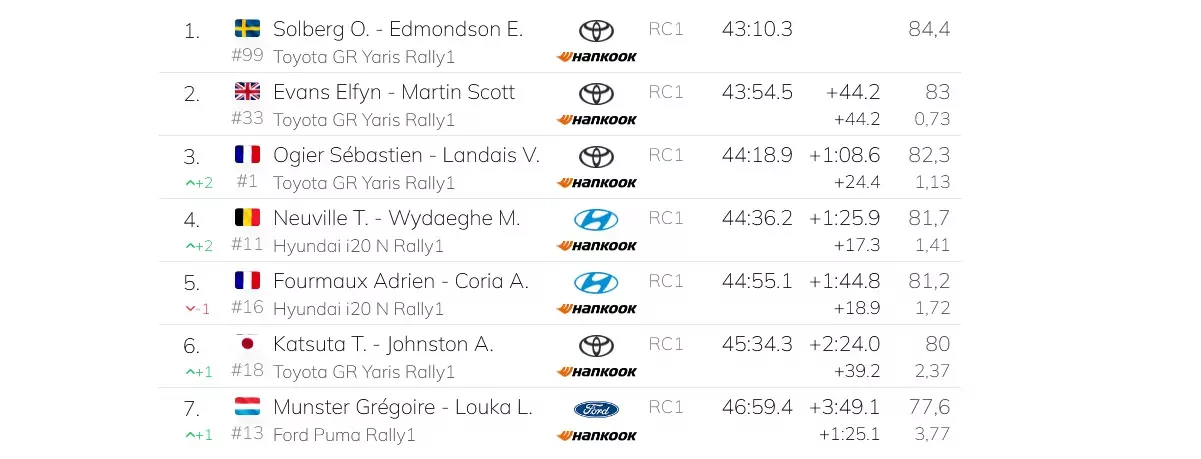 O godzinie 14:30 w porcie jachtowym w Monako oficjalnie wystartował sezon WRC. Po ceremonii startu zawodnicy udali się na północ. Ponad 60-kilometrowa dojazdówka doprowadziła ich na oes Toudon / Saint-Antonin. Kręty, techniczny, bardzo mokry… ale jednak bez żadnego śniegu, ani lodu. Można więc stwierdzić, że warunki były równe. Wręcz premiujące tych, którzy jechali z przodu, bo z biegiem czasu na drodze pojawiało się coraz więcej rajdowego „syfu” wyciągniętego z cięć. Najlepszym czasem popisali się Elfyn Evans i Scott Martin. Podium skompletowali ich koledzy z Toyoty – Oliver Solberg z Elliottem Edmondsonem oraz Sebastien Ogier z Vincentem Landais. Na tym „normalna” rywalizacja tego dnia się zakończyła.