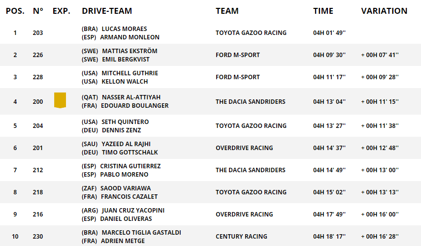 Między 138 a 183 kilometrem odcinka była sekcja wydm, ale… czy aż tak wymagająca? Takie różnice przecież wywróciłyby klasyfikację generalną do góry nogami. Nagle na mecie doznaliśmy kolejnego szoku. Gigantyczne różnice nagle zniknęły. Ekstrom zakończył etap na 2. miejscu, niecałe 8 minut za zwycięzcą, Lucasem Moraesem. Al-Attiyah był 4., Al Rajhi 6. Niepokojąco wciąż wyglądała jednak sytuacja liderującego w rajdzie Lategana, który zakończył etap prawie 20 minut za jego zwycięzcą. Co tam się działo? Czy w myśl słów jednego z hitów, dakarowy los raz daje, raz zabiera?