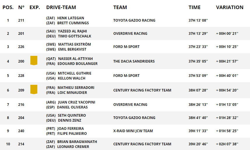 To był niezwykle ważny etap w kontekście klasyfikacji generalnej rajdu. Liderami wciąż są Henk Lategan i Brett Cummings, natomiast ich przewaga nad drugimi Yazeedem Al Rajhim i Timo Gottschalkiem zmalała do zaledwie 21 sekund! Nie trzeba nikomu tłumaczyć, że na Rajdzie Dakar to tyle co nic. Walka o zwycięstwo rozpoczyna się od nowa i nikt nie ma w niej żadnej przewagi – powiedzmy to sobie wprost. Dalej też jest ciekawie. Mattias Ekstrom i Emil Bergkvist zmniejszyli stratę do liderów do nieco ponad 10 minut a Nasser Al-Attiyah i Edouard Boulanger do niecałych 22. I ich również nie możemy wykluczyć z walki o zwycięstwo. Nawet kierowcy Dacii Sandrider.