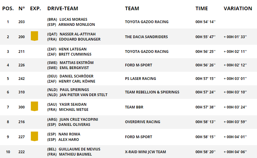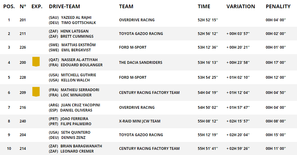 Zwycięzcami rajdu zostali Yazeed Al Rajhi i Timo Gottschalk. Henk Lategan i Brett Cummings próbowali dziś niemal wszystkiego, ale nie byli w stanie odrobić strat. Rajd kończą ostatecznie niecałe 4 minuty za Al Rajhim i Gottschalkiem. W całej tej walce może być trochę szkoda Lategana, bo prowadził niemal przez cały rajd. Natomiast popełniał też bardzo kosztowne błędy, szczególnie w końcówce. Al Rajhiego należy docenić za to, że cały czas był tuż za plecami reprezentanta RPA. I kiedy pojawiła się szansa, wykorzystał ją. Lategan wczoraj znów popełnił błąd, Al Rajhi objął prowadzenie i dzisiaj nie miał prawa go wypuścić. Dakar dla Saudyjczyka!