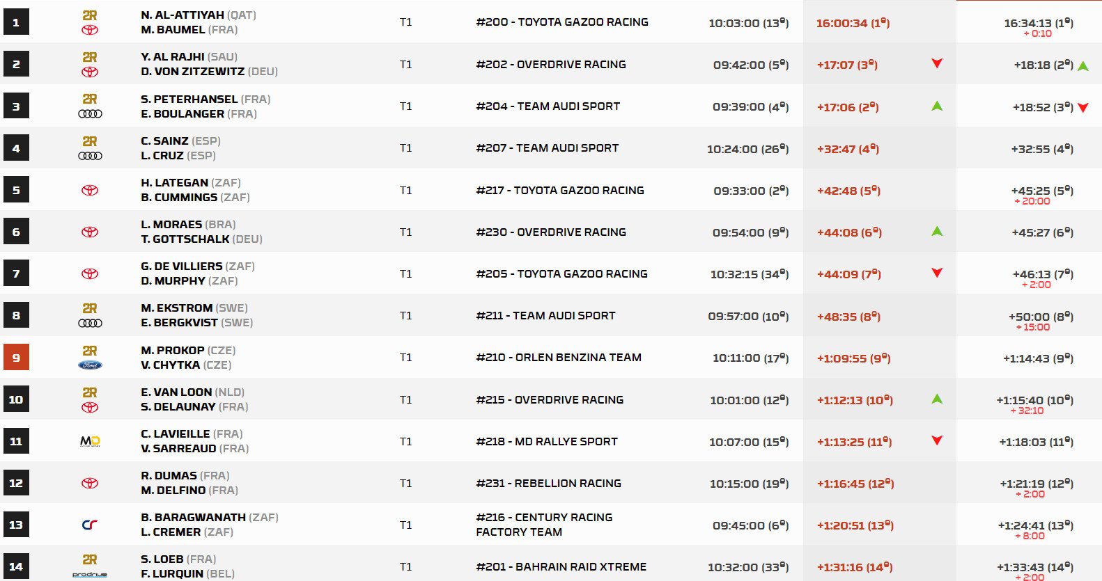 W klasyfikacji generalnej Al-Attiyah ma 18 minut i 18 sekund zapasu nad Yazeedem Al-Rajhim. Trzeci Stephan Peterhansel jest 34 sekundy za Saudyjczykiem. Carlos Sainz do zespołowego kolegi traci ponad 14 minut.