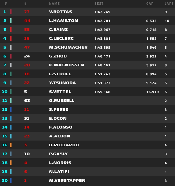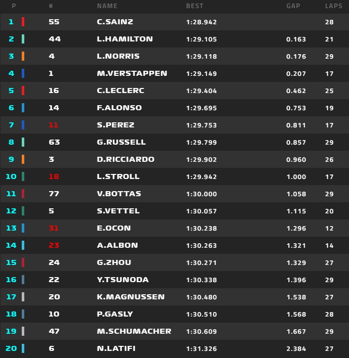 W warunkach tych najlepiej spisał się Valtteri Bottas. Fin zapewnił ekipie Alfa Romeo F1 Team ORLEN pierwszą wygraną sesję treningową od 2018 roku. Za Bottasem ze stratą ponad pół sekundy znalazł się Lewis Hamilton. Mniej niż sekundę stracił jeszcze Carlos Sainz. Guanyu Zhou popisał się szóstym rezultatem.
