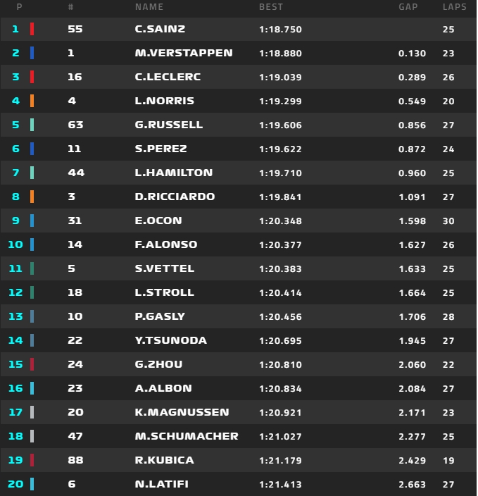 Ostatecznie Robert Kubica nie poprawił już swojego czasu i został sklasyfikowany na dziewiętnastej pozycji. Sesję do swojego CV dopisał Carlos Sainz. Hiszpan był o 0,130 sekundy lepszy od Maxa Verstappena. Za trzecim Charlesem Leclerc’em sklasyfikowano Lando Norrisa z McLarena i George’a Russella z Mercedesa. Dopiero szósty był Sergio Perez, który narzekał na alergię. Drugi kierowca Alfa Romeo F1 Team ORLEN: Guanyu Zhou uzyskał piętnasty rezultat.