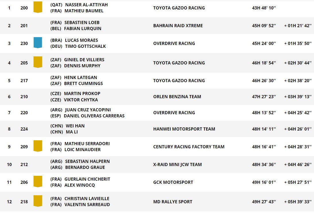 W klasyfikacji generalnej Nasser Al-Attiyah przed ostatnim etapem ma ponad godzinę i dwadzieścia minut zapasu nad Sebastienem Loebem. Blisko kwadrans do Francuza traci najlepszy z debiutantów: Lucas Moraes. Brazylijczyk ma prawie godzinę przewagi nad czwartym Ginielem de Villiersem.