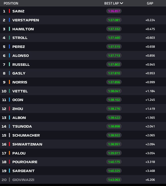 Ostatecznie najszybszy był Carlos Sainz. Hiszpan był o 0,224 sekundy lepszy od Maxa Verstappena. 0,475 sekundy stracił Lewis Hamilton. Za czołową trójką sklasyfikowano Lance Strolla (+0,603), Sergio Pereza (+0,658). Fernando Alonso, George Russell, Pierre Gasly i Lando Norris zmieścili się w sekundzie straty do najlepszego. Z dwójki Alfa Romeo F1 Team ORLEN lepszy był Guanyu Zhou. Chińczyk znalazł się na dwunastej pozycji. Theo Purchaire został sklasyfikowany na osiemnastej pozycji.