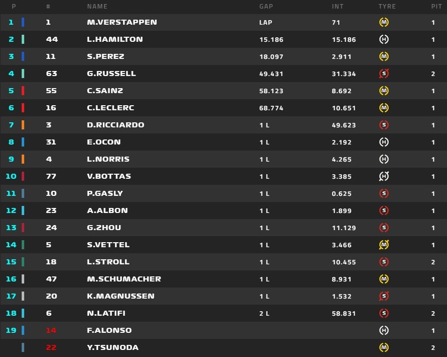 Ostatecznie Max Verstappen przekroczył linię mety z blisko 15-sekundowym zapasem. Z drugiego miejsca cieszy się Lewis Hamilton, a z najniższego stopnia podium Sergio Perez. Drugą trójkę utworzyli George Russell, Carlos Sainz i Charles Leclerc. Punkty wywalczyli też Daniel Ricciardo, Esteban Ocon, Lando Norris i Valtteri Bottas z Alfa Romeo F1 Team ORLEN. Guanyu Zhou zobaczył flagę w szachownicę jako trzynasty kierowca.