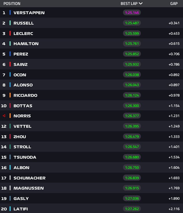 W ostatnich dwudziestu minutach jazd zespoły i kierowcy zdecydowali się na sprawdzenie tempa wyścigowego i nie doszło do zmian w czołówce klasyfikacji sesji. Max Verstappen zostawił za sobą George’a Russella, Charlesa Leclerca i Lewisa Hamiltona.