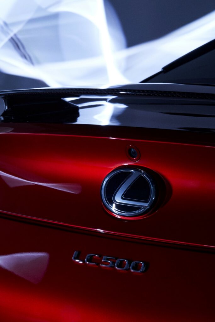 Unikatowy Lexus LC 500 wyróżnia się czerwonym lakierem. Pojazd ten otrzymał pakiet Black, w którego skład wchodzą takie rzeczy jak: czarne detale przedniego grilla, przedniego zderzaka, tylnych świateł oraz reflektorów. Co więcej, istnym wypełnieniem wyglądu są 21-calowe, pięcioramienne felgi, które są stworzone z kutego aluminium w kolorze czarnym.