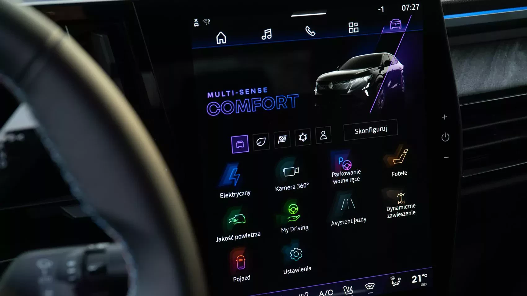 Renault Rafale Atelier Alpine wyposażony jest w najnowsze technologie, które podnoszą komfort i bezpieczeństwo jazdy. System multimedialny oparty na platformie Android zapewnia intuicyjną obsługę oraz szybki dostęp do funkcji takich jak nawigacja, multimedia czy łączność ze smartfonem. Ekran dotykowy o przekątnej 12,3 cala charakteryzuje się wysoką rozdzielczością i czytelnością. Dodatkowo, system audio Harman Kardon z 12 głośnikami dostarcza wyjątkowe doznania dźwiękowe. W zakresie bezpieczeństwa, Rafale oferuje m.in. adaptacyjny tempomat, czy system utrzymania pasa ruchu. Jest też monitorowanie martwego pola oraz asystenta parkowania.